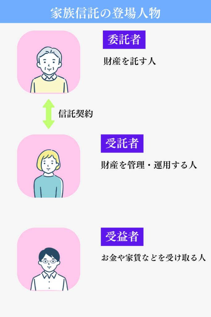 家族信託とは、親(委託者)が自分の財産を、信頼できる家族(受託者)に託し、その管理や運用を任せる仕組みです。
