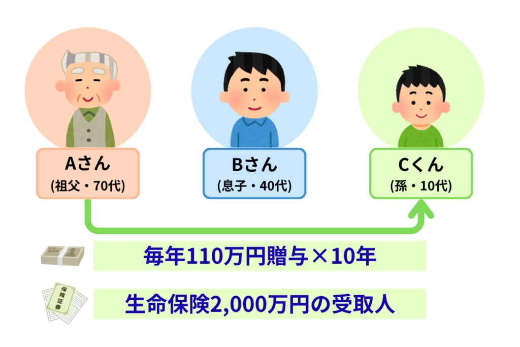 - 生命保険の加入: 自分が亡くなった時に、孫のCくんが2,000万円受け取れるよう、受取人を孫に指定。