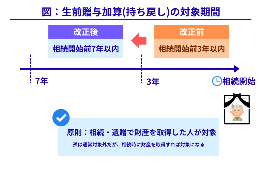 - 改正前のルール: 亡くなる前 3年以内 の贈与が対象