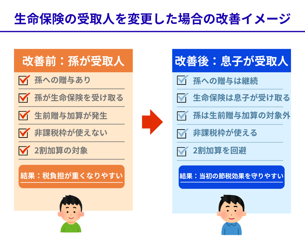 「節税のために孫に贈与した」という10年間の努力の大部分が、保険のせいで無効化されるわけです。