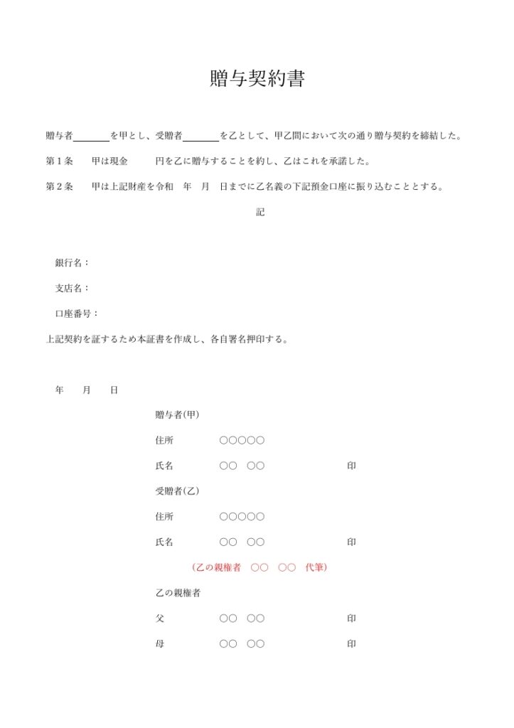 未成年者への贈与を確実に成立させるためには、贈与契約書に受贈者(もらう人)本人の情報だけでなく、親権者の署名捺印をセットで行うことが実務上のポイントです。